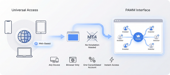 The PAMM system provides a user-friendly, web-based interface accessible from any device with a standard web browser, eliminating the need to install MT4.