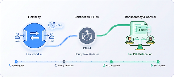 Investors can quickly join or exit a PAMM account, usually within a few business hours. The hourly NAV calculation ensures transparent profit/loss allocation for all trades.
