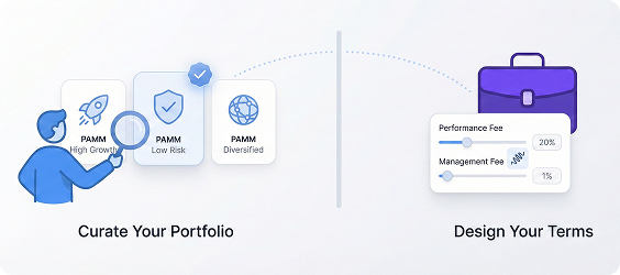 Investors independently choose which PAMM accounts to join, while managers can create flexible fee structures.